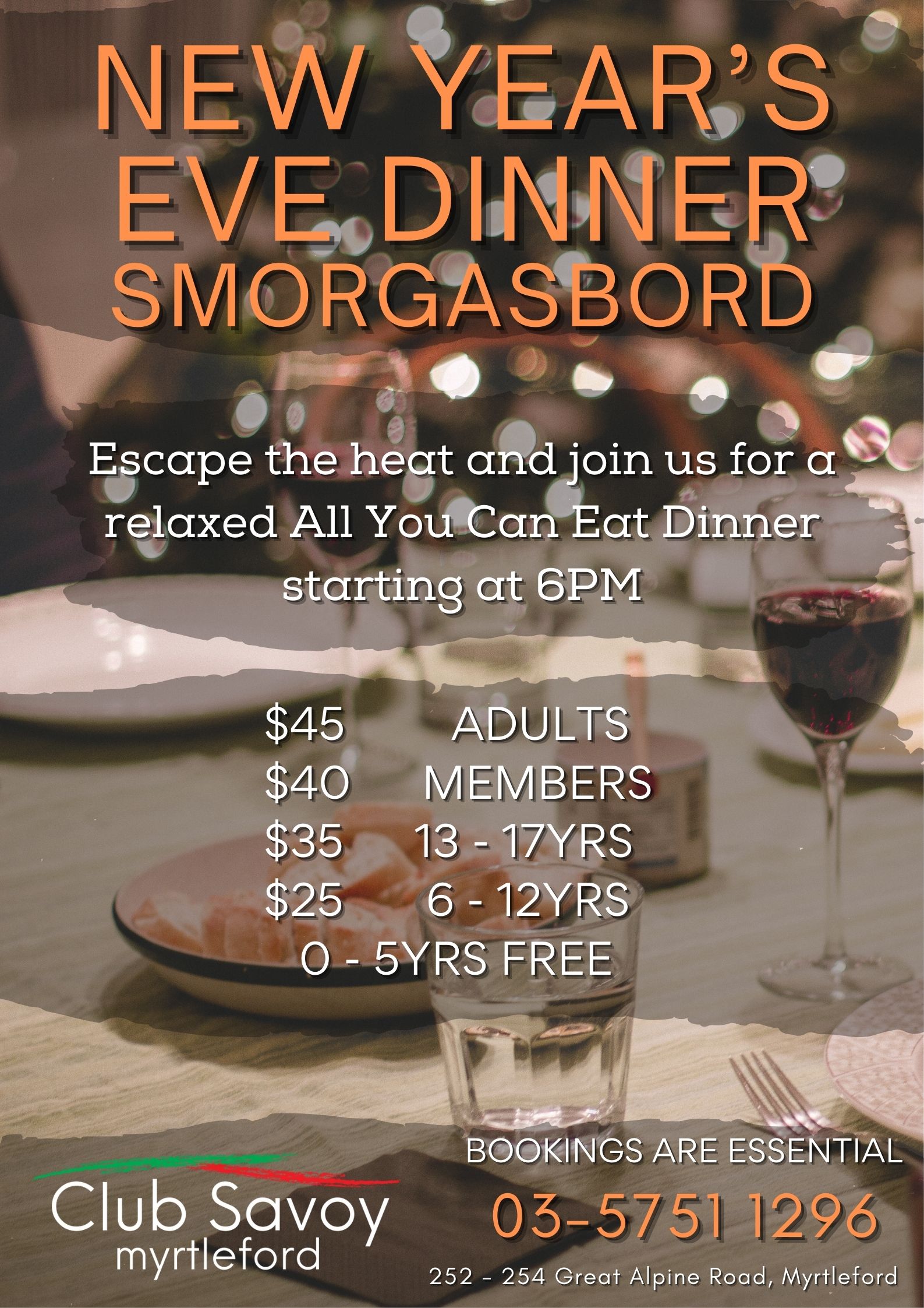Club Savoy 252 – 254 Great Alpine Rd, Myrtleford, Victoria, AustraliaGather the family and join us for an All You Can Eat Dinner! With dessert included! Doors open at 6pm Bookings are essential - please call 035751 1296