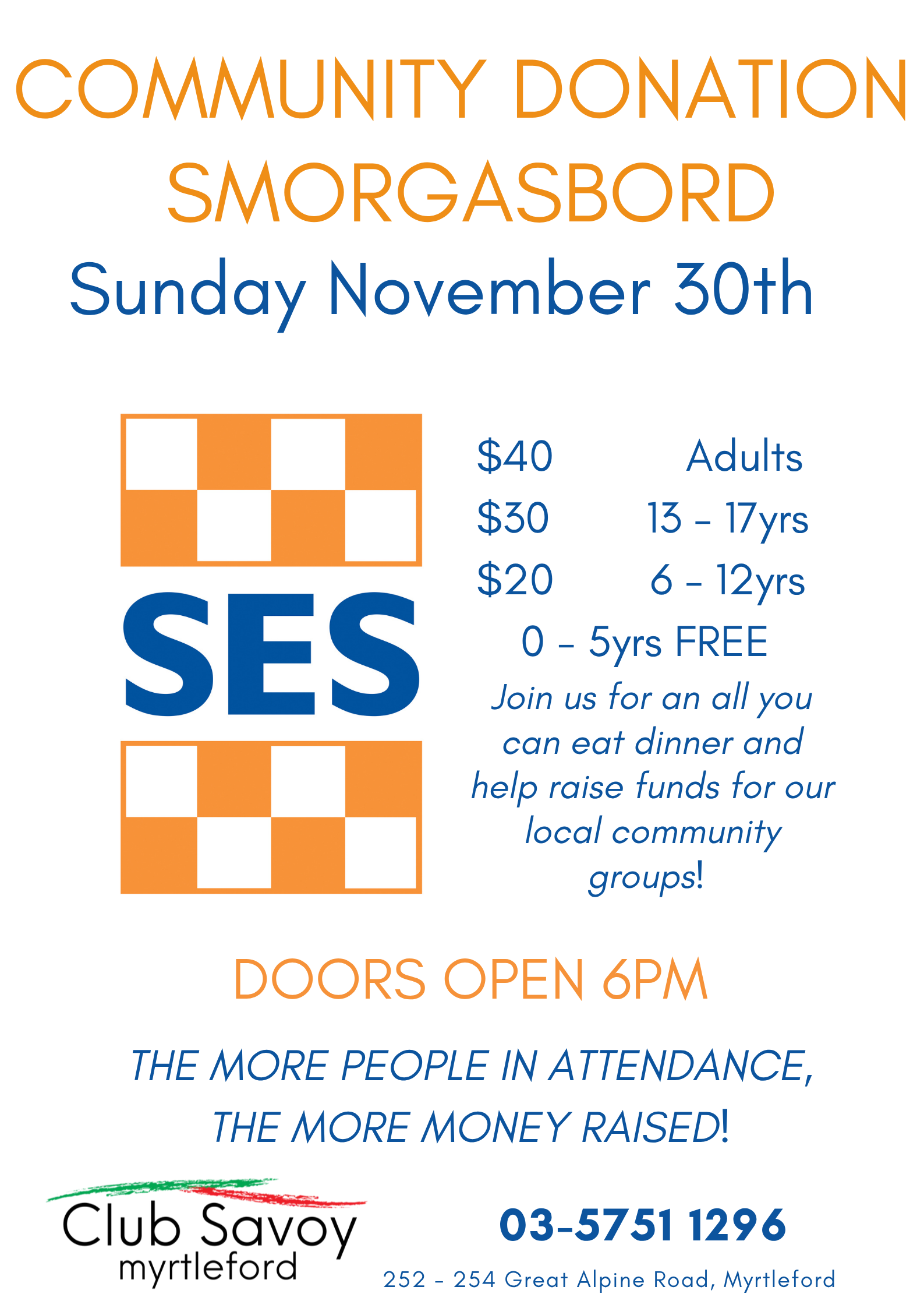 Join us for dinner and help raise funds for our well-deserving local community groups! A percentage of door sales on the night will be donated to the Myrtleford SES! All […]